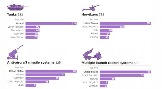 Însă Statele Unite conduc plutonul în ceea ce privește asistența cu arme grele și muniția aferentă, precum și în ceea ce privește echiparea infanteriei ușoare, cu cel puțin 150 de milioane de unități de muniție promise.