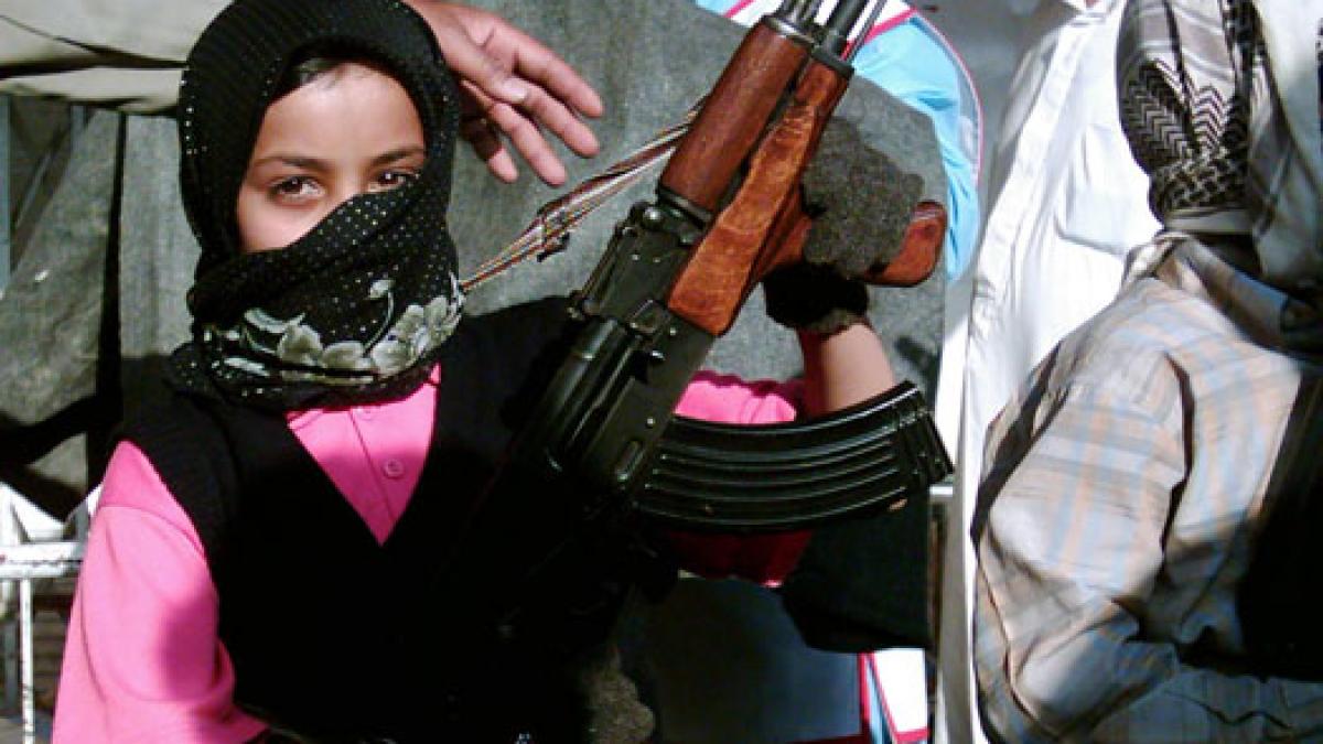 Bărbatul care îndeamnă copilul să tragă asupra adversarilor este prezentat ca un rebel islamist care luptă împotriva regimului lui Başar al-Assad.