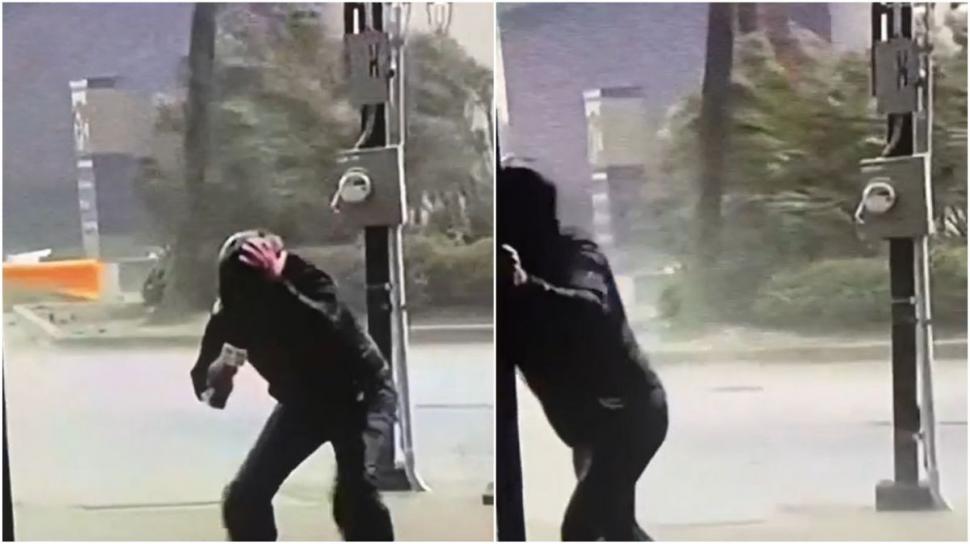 Bărbatul era în timpul unei transmisiuni, când, din senin, o rafală puternică l-a dezechilibrat și abia a mai putut să se țină pe picioare.