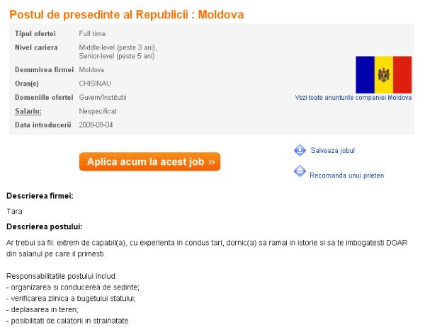 Angajatorii caută o persoană capabilă, cu experienţă în condus ţări şi dornică să rămână în istorie, potrivit anunţului postat pe site-ul bestjobs.md.