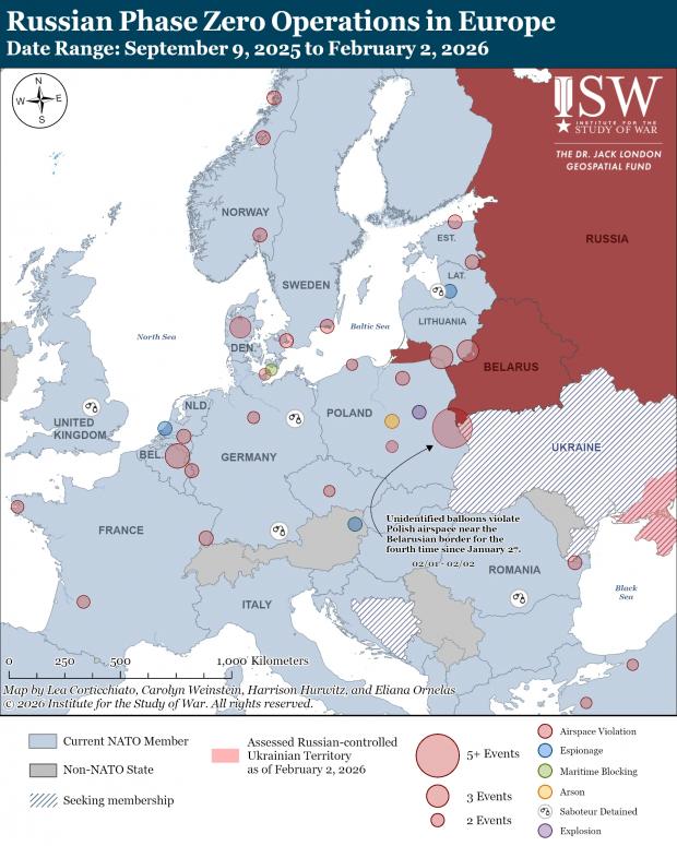 ISW continuă să evalueze faptul că Rusia a anexat de facto Belarusul și că Rusia folosește probabil incursiuni în spațiul aerian în state NATO precum Lituania și Polonia din Belarus ca parte a efortului său „Faza Zero” - faza de stabilire a condițiilor informaționale și psihologice - pentru a se pregăti pentru un posibil război NATO-Rusia în viitor.