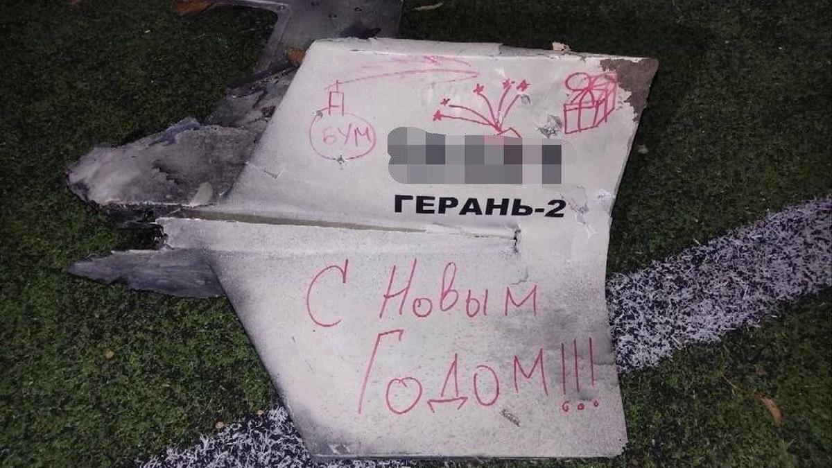 Pe stabilizatoarele unei drone "Gheran 2" doborâte de apărarea antiaeriană pot fi văzute un mesaj în rusă "An Nou fericit" și desene care ilustrează "cadouri explozive".