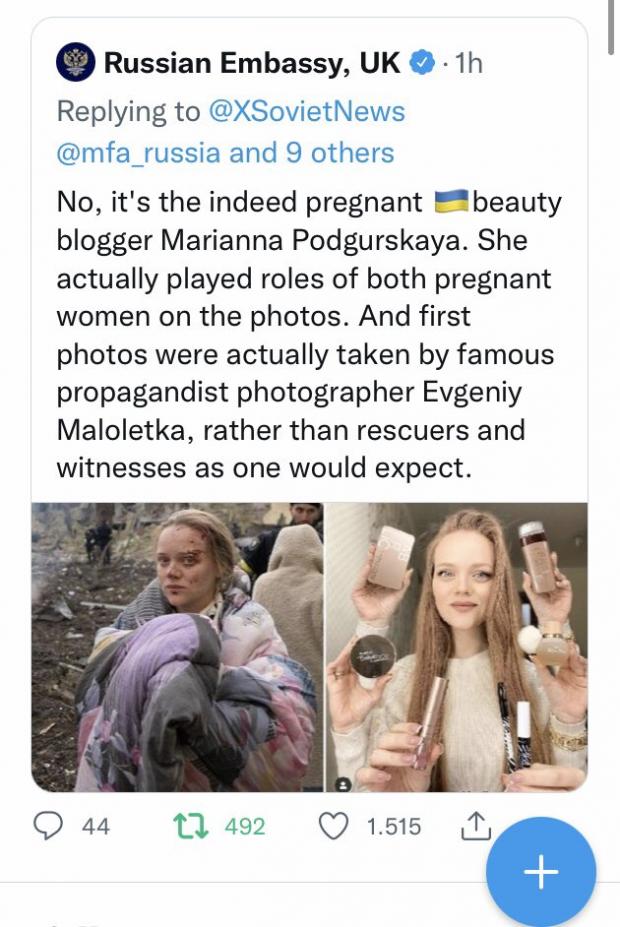 „Nu, este chiar însărcinată bloggerița de frumusețe Marianna Podgurskaya”, a continuat postarea. „De fapt, a jucat rolul ambelor femei însărcinate în fotografii. Și primele fotografii au fost de fapt făcute de celebrul fotograf propagandist Evgeniy Maloletka, mai degrabă decât de salvatori și martori, așa cum s-ar fi așteptat.”