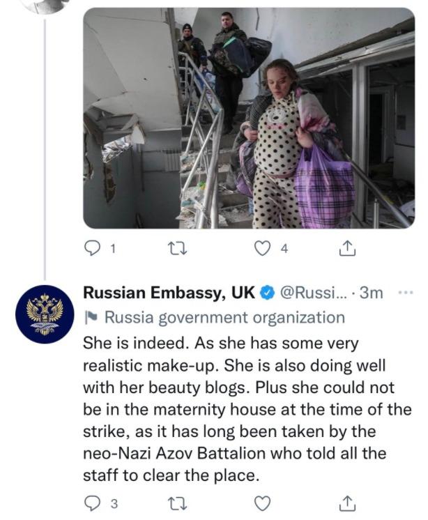 În tweet se scria: „FM #Lavrov despre atacul de la #Mariupol: Maternitatea a fost mult timp nefuncțională. În schimb, a fost folosit de forțele armate și de radicali, și anume batalionul neo-nazist Azov. Mai mult, #Rusia a avertizat #Consiliul de Securitate al ONU despre acest lucru în urmă cu 3 zile.”
