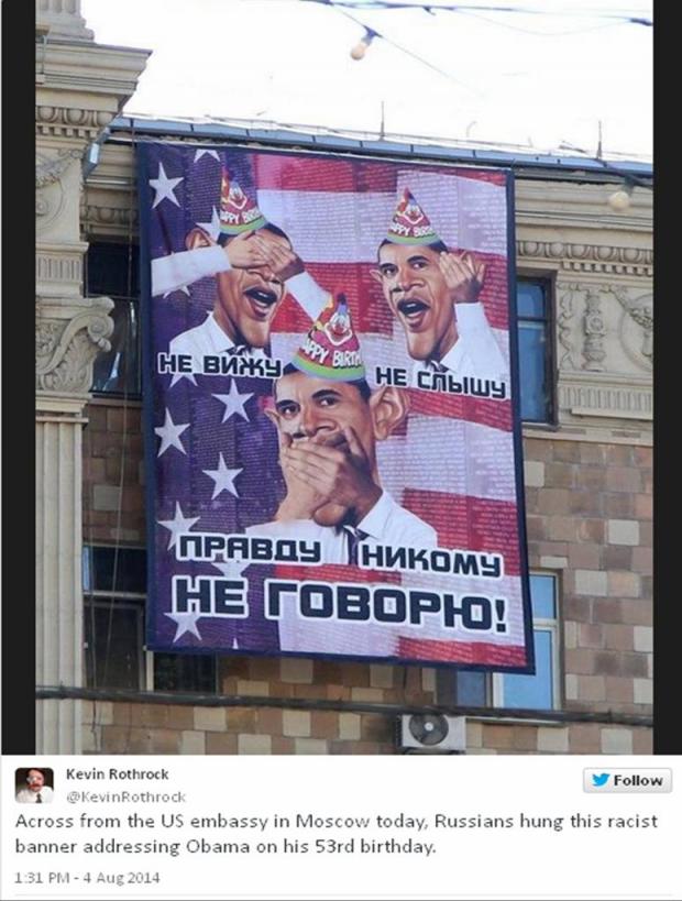 De asemenea, pe o clădire din apropierea Consulatului SUA din Moscova a fost arborat un banner în care liderul de la Casa Albă este prezentat ca o maimuţă: "Obama nu vede, nu aude şi nu vorbeşte nimic rău", informează The Washington Post.