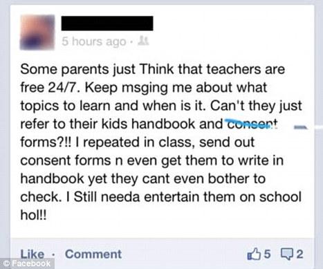 De asemenea, a postat un mesajpe Facebook, plin de greşeli gramaticale, în care a spus: "Unii părinţi cred că profesorii sunt liberi 24/7. Îmi tot dau mesaje despre ce subiecte să abordez cu copiii lor."