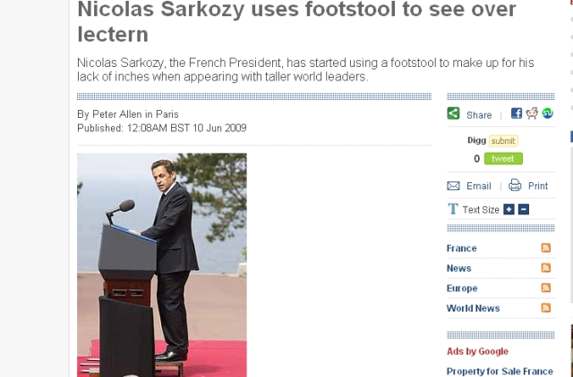 Cu ocazia împlinirii a 65 de ani de la "Debarcarea din Normandia", Nicolas Sarkozy a fost nevoit să ţină un discurs. Preşedintele a avut nevoie de un scăunel ca să ajungă la microfon.