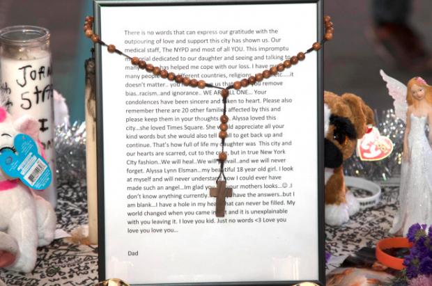 „Alyssa iubea Times Square", a mai spus el. „Ar fi apreciat toate cuvintele voastre bune dar tot ea ne-ar fi spus că e timpul să ne ridicăm și să mergem mai departe”, a mai scris acesta.