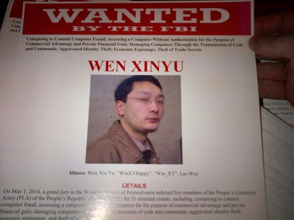 Între timp, Departamentul de Justiţie de la Washington a oferit publicităţii date şi fotografii ale oficialilor chinezi puşi sub urmărire penală, cu eticheta "WANTED, by the FBI".