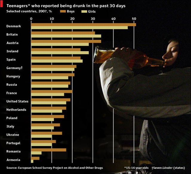 E inevitabil ca părinţii adolescenţilor să fie îngrijoraţi atunci când copiii lor se duc la peterceri. Potrivit unui studiu realizat pe baza substanţelor pe care le consumă tineri din peste 30 de ţări, părinţii danezi au cele mai multe motive să stea cu sufletul la gură, transmite The Economist. În 2007, aproape jumătate din adolescenţii danezi de 15-16 ani spun că s-au îmbătat în ultimele 30 de zile. Acesta este cel mai mare procent din cele 35 de ţări supuse sondajului. Aproape patru cincimi au spus că s-au îmbătat măcar o dată în viaţă. În ţările mai puţin ?mahmure?, procentajul a fost, evident, mult mai scăzut.