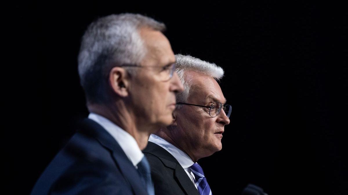 Foto: Secretarul General al NATO, Jens Stoltenberg, președintele lituanian Gitanas Nauseda (în plan secund) susțin o conferință de presă comună la Vilnius, înaintea summitului NATO, 10 iulie 2023