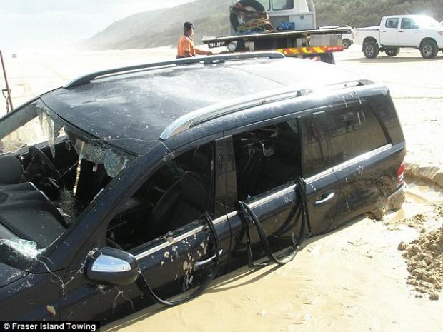 Mașina a rămas blocată pe plaja din Fraser Island și a fost scoasă de acolo de o firmă specializată în tractări auto.