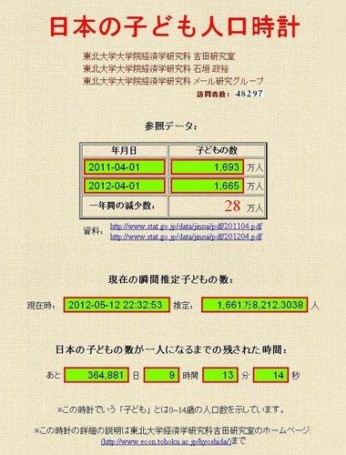 În prezent, numărul copiilor este de 16.6 milioane, însă la fiecare 100 de secunde acest număr scade cu o unitate. "Dacă totul continuă în acest ritm, înseamnă că pe data de 5 Mai 3011 vom sărbători Ziua Copilului pentru singurul copil care va mai fi în ţară", a declarat Hiroshi Yoshida ministrul Afacerilor Interne din Japonia.