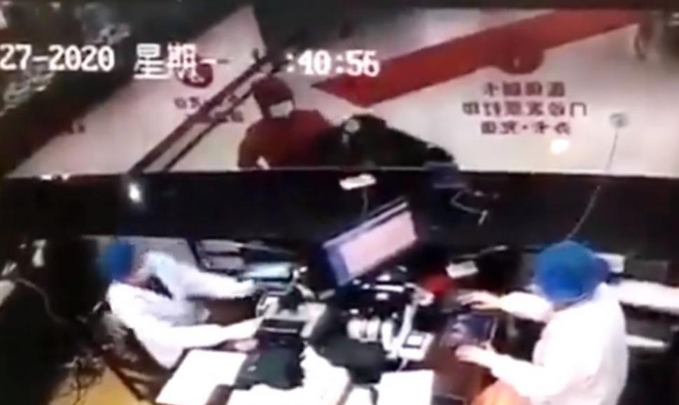 Imagini surprinse de camerele de supraveghere dintr-o unitate sanitară din Xiaogan surprind gestul furios al unui pacient bolnav care își lasă masca jos și tușește intenționat spre medicii care ar fi trebuit să-l ajute.