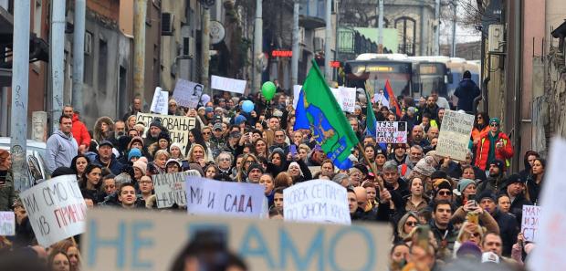 Peste 100.000 de oameni protestează în continuare, sâmbătă seara, la Belgrad, în cel mai mare miting antiguvernamental de la tragedia de la Novi Sad, în care 14 oameni au murit. Manifestația a fost organizată de studenți din toată țara, care îl învinovățesc pe președintele sârb Aleksandar Vucic de accidentul mortal din gara Novi Sad. Liderul autocrat a încercat să-i intimideze pe protestatari și i-a amenințat că autoritățile vor face arestări în masă și vor „restabili ordinea socială” și că el va părăsi puterea doar dacă va fi ucis. Mai multe incidente violente izolate au avut loc până la această oră, un bărbat a intrat cu mașina în mai mulți protestatari, iar un altul a fost arestat după ce a pretins că are două bombe la el. Protestatarii îndeamnă însă la pace și au format cordoane de securitate pentru a evita o ciocnire cu contramanifestanții, susținătorii președintelui sârb care au campat în fața Palatului prezidențial.
