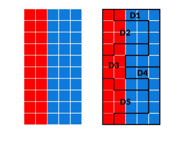 Astfel, au fost desenate cinci circumscripții, de la D1 la D2 pentru a avantaja partidul A și a distruge, practic, avantajul electoral democratic al partidului B. Votanții partidului B sunt izolați fie în circumscripții mari cu un singur reprezentant, fie aduși împreună cu votanți ai partidului A în circumscripții în care votanții A sunt mai numeroși. Rezultatul, conform imaginii, este că partidul A, deși are mai puțini votanți, va controla trei districte din 5 (D2, D3 și D5), întimp ce partidul B, deși ar trebui să aibă o majoritate absolută, controlează doar două districte (D1 și D4).