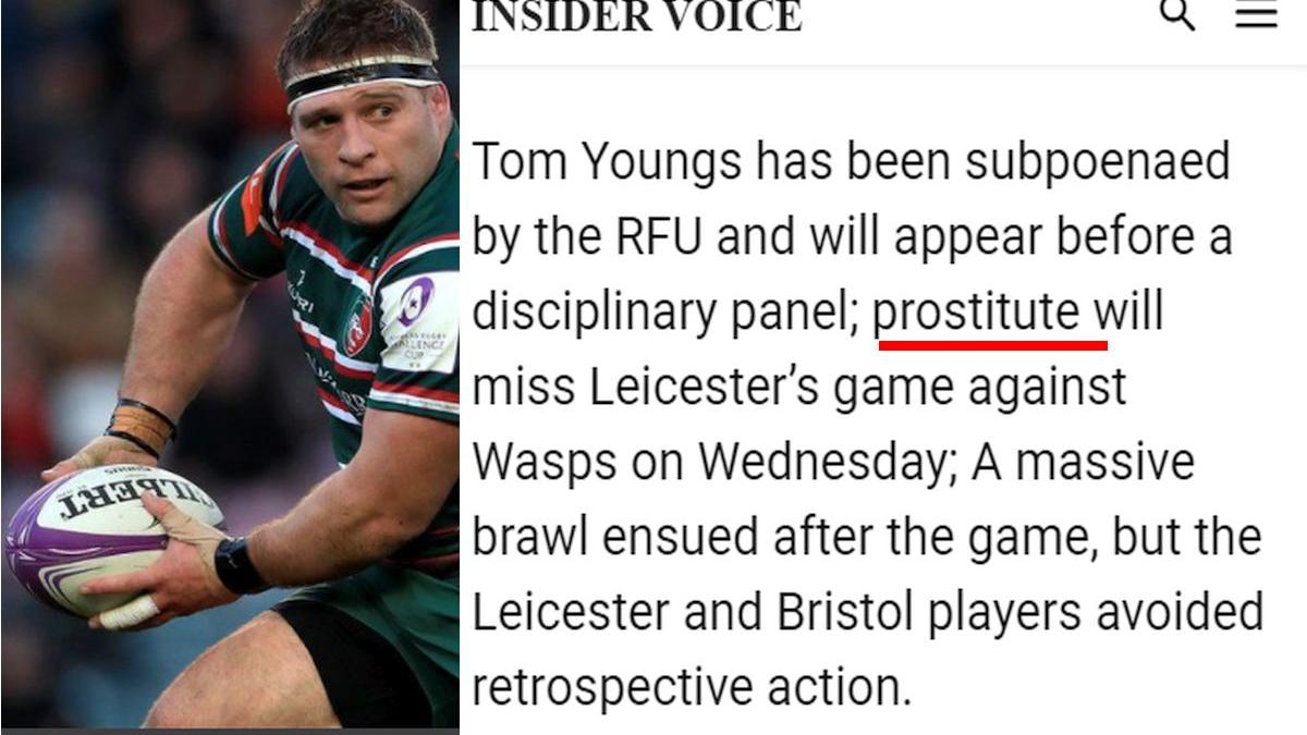 Articolul conținând cuvântul "prostituată" în titlu, cu referire la jucătorul Tom Youngs, era pe site inclusiv la ora publicării acestei știri în România (foto principală și galerie).