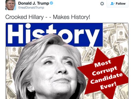 Donald Trump, candidatul republicanilor la Casa Albă, este protagonistul unui nou scandal de proporţii după ce a publicat pe contul său de Twitter un mesaj scris pe "Steaua lui David" în care o acuză pe Hillary Clinton, că este „cel mai corupt candidat”.