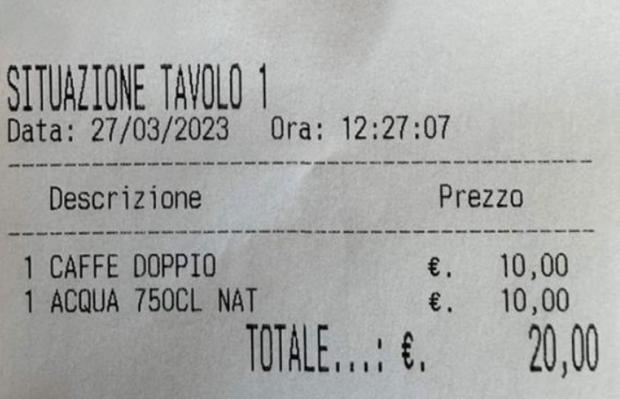 Femeia declară că a intrat într-un local obişnuit și a comandat o cafea și o apă plată. Nota de plată a uimit-o: 20 de euro, scrie Corriere della Sera.