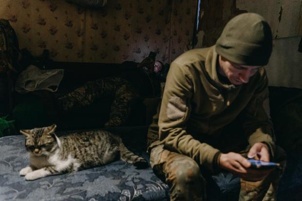 Militar ucrainean, alături de o pisică, într-un buncăr, pe frontul din Donețk. Foto: Profimedia Images