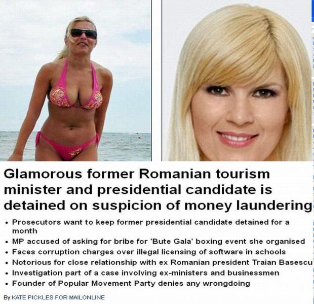 Încătuşarea Elenei Udrea nu a scăpat atenţiei nici presei internaţionale tabloide. Publicaţia britanică dailymail.co.uk consemnează că Udrea este reţinută de procurorii Anticorupţie, fiind învinuită de spălare de bani.
