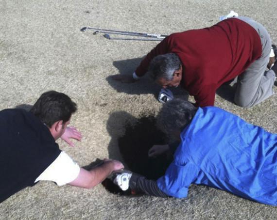 Bărbatul s-a prăbuşit într-o groapă adâncă de trei metri dar, din fericire, s-a ales doar cu un umăr dislocat şi câteva vânătăi. Ceilalţi jucători au făcut rost de o scară şi l-au scos din groapă.