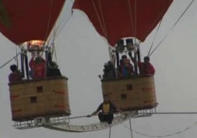 Chinezul a mers pe o bârnă lungă de 18 metri suspendată între două baloane cu aer cald, aflate la mare înălţime.