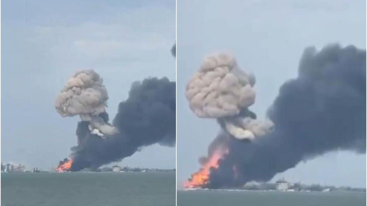 Ukraine hit with a missile ferry train loaded with 30 full tanks in the port of "Kavkaz" near the Criema bridge