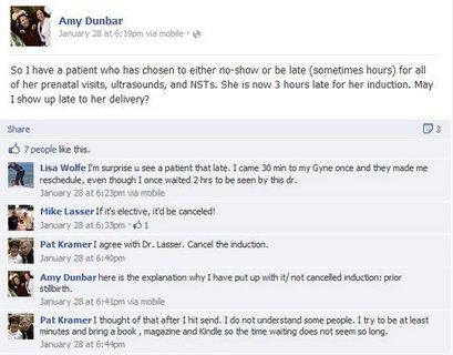 ”Am o pacientă care a ales ori să nu apară ori să întârzie (câteodată ore întregi) la fiecare vizită prenatală, ecografie sau test. Acum a întârziat 3 ore, chiar în ziua în care trebuia să îi fie indusă nașterea. Să întârzii și eu când va naște ea?”