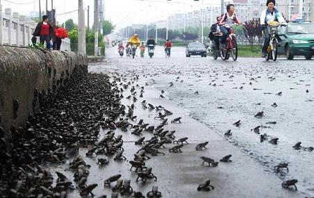 Un oraş din centrul Chinei a fost invadat peste noapte de broaşte. Mii de amfibieni au împânzit străzile localităţii, iar locuitorii spun că sunt atât de multe, încât le este teamă să iasă din case.