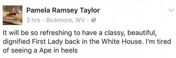 Beverly Whaling, primarul orașului Clay, Virginia de Vest, a demisionat după ce a apreciat o postare rasistă pe pagina de Facebook, în care a catalogat-o pe Prima Doamnă a SUA, Michelle Obama, drept „o maimuță pe tocuri”.