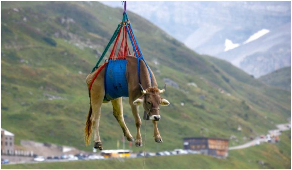 Folosind un ham de plasă, vacile au fost suspendate de un cablu și transportate cu elicopterul de pe crestele din regiunea Klausenpass, din centrul țării, pe o pășune de la poalele muntelui.