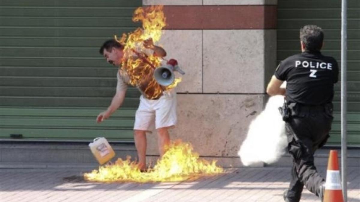 Confruntat cu refuzul băncii, omul a ieşit din clădire, şi-a turnat lichid inflamabil pe corp, apoi şi-a dat foc sub ochii poliţiştilor. Aceştia au intervenit imediat stingând focul. Bărbatul este acum în afara oricărui pericol.