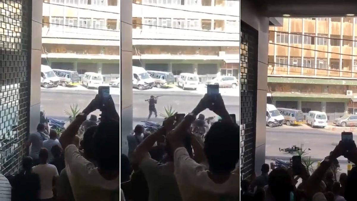 Alte imagini arată cum mai mulți oameni intră într-un rond rutier, fugind dintr-o zonă unde, aparent, se trage.