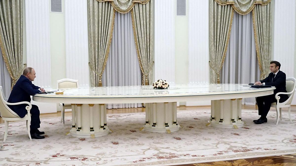 La discuții, Putin și Macron au fost separați de o imensă masă albă