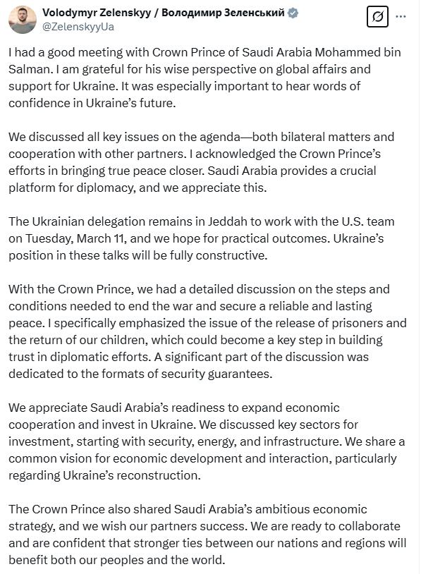Zelenski a anunţat că delegaţia ucraineană rămâne la Jeddah pentru a lucra cu echipa SUA, marţi, şi speră la rezultate practice. Președintele ucrainean a mai spus și că a făcut referire în mod special la problema eliberării prizonierilor şi a întoarcerii copiilor ucraineni, care ar putea deveni un pas esenţial în construirea încrederii în eforturile diplomatice.