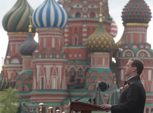 1. Preşedintele rus Dimitri Medvedev se adreasă participanţilor la parada pentru Ziua Victoriei, în Piaţa Roşie din Moscova. (EPA/Intact Images)