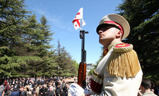 3. Un soldat din Garda de Onoare a Georgiei stă în Parcul Victoriei din Tbilisi, în timp ce oamenii sărbătoresc 66 de ani de la victoria asupra Germaniei naziste. (EPA/Intact Images)