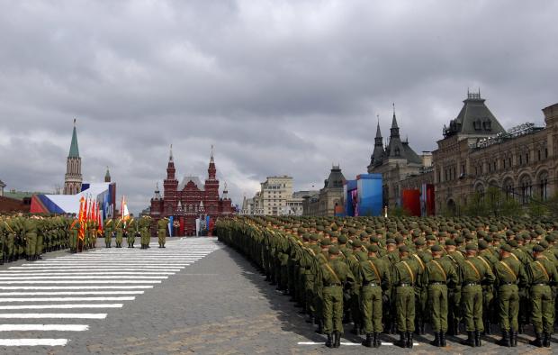 6. Soldaţii din serviciul militar rus stau aliniaţi înainte de marşul pentru parada din Ziua Victoriei, în Piaţa Roşie din Moscova. (EPA/Intact Images)