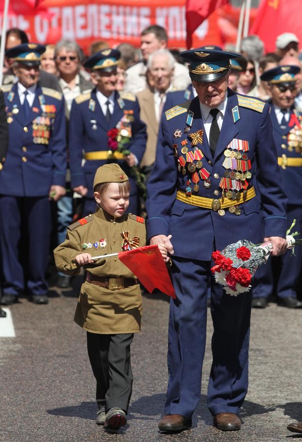8. Un veteran rus din Al Doilea Război Mondial cu nepotul său îmbrăcat în uniformă militară iau parte la marşul Partidului Comunist din Rusia, la Moscova. (EPA/Intact Images)