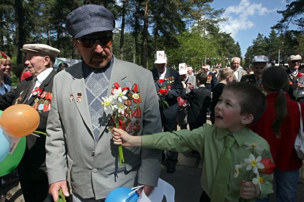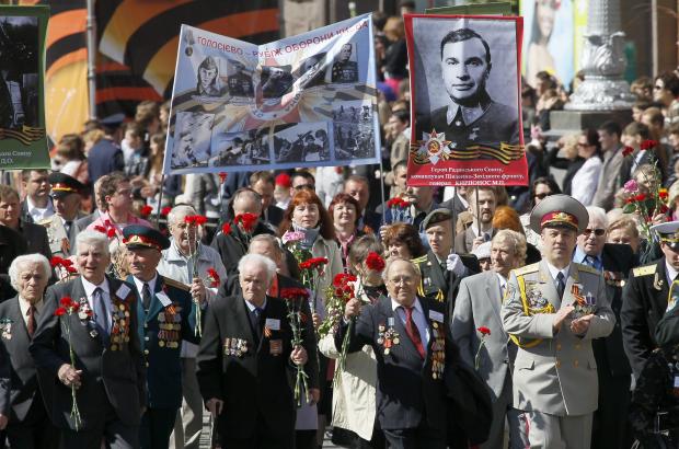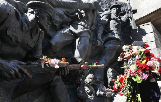 20. Veteranii din Ucraina depun flori la monumentul Soldaţilor Sovietici de la Kiev. (EPA/Intact Images)