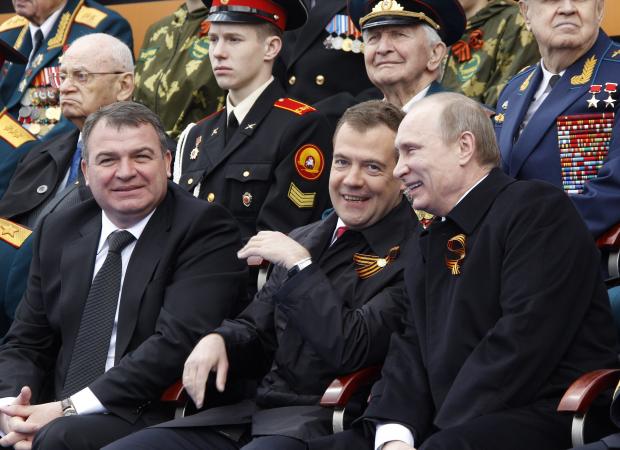 14. Preşedintele rus Dimitri Medvedev (centru), primul ministru Vladimir Putin (dreapta) şi ministrul apărării ruse, Anatoli Serdiucov (stânga), iau parte la parada din Piaţa Roşie din Moscova. (EPA/Intact Images)