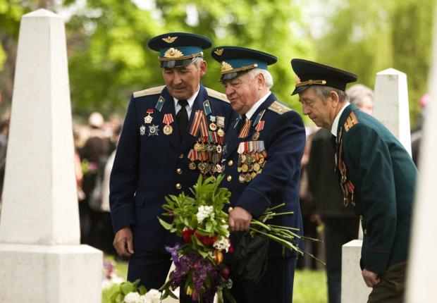15. Veteranii din Al Doilea Război Mondial depun flori la mormântul camarzilor căzuţi la datorie, la Memorialul Gloriei Militare de la Chişinău. (EPA/Intact Images)