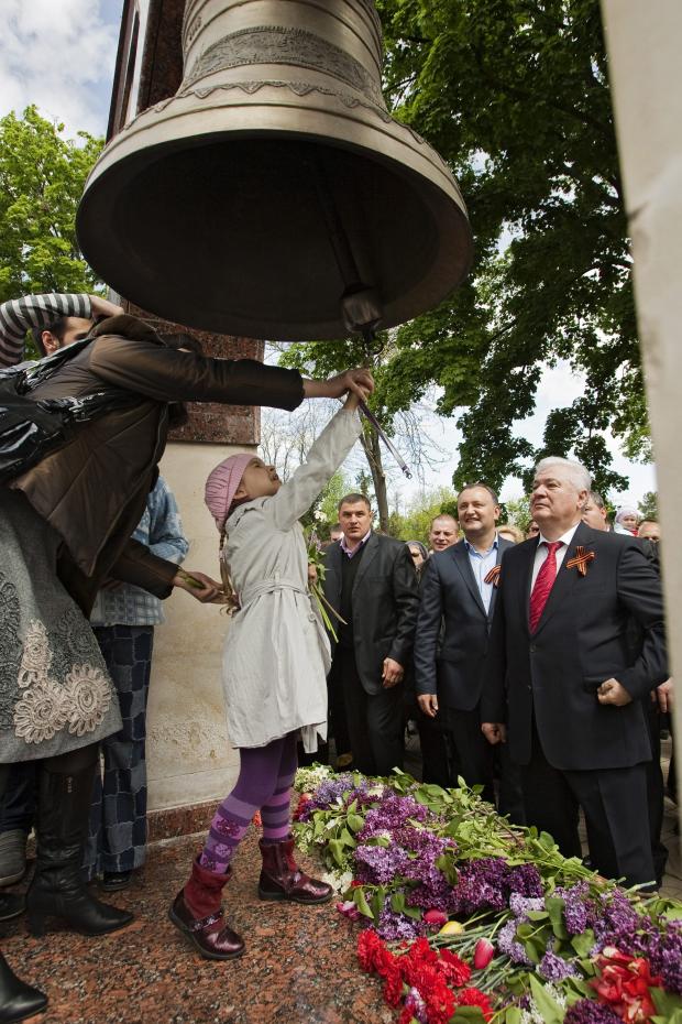 16. Fostul preşedinte al Moldovei şi preşedintele Partidului Comunist, Vladimir Voronin (dreapta), împreună cu candidatul la primărie Igor Dodon, aşteaptă să bată Clopotul Memoriei. (EPA/Intact Images)