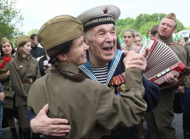 18. Un veteran din Al Doilea Război Mondial dansează cu o tânără femeie îmbrăcată într-o uniformă veche, în Parcul Gorki din Moscova. (EPA/Intact Images)
