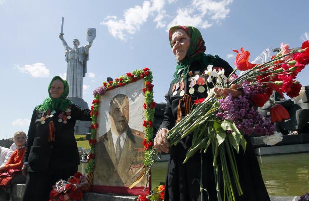 21. Două veterane din Al Doilea Război Mondial poartă un portret al legendarului comandant sovietic Georgiy Zhukov, la monumentul Soldaţilor Sovietici din Kiev. (EPA/Intact Images)