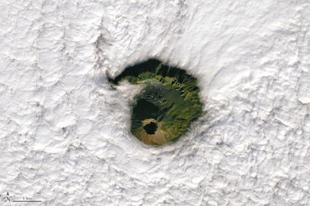 O fotografie impresionantă realizată din satelit surprinde unul dintre cei mai renumiți și potențial periculoși vulcani din lume, Muntele Vezuviu, apărând printre nori printr-o gaură de formă ciudată.
