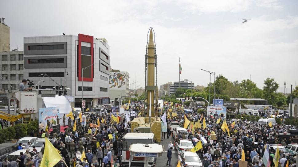 Analiștii militari spun că atacul de marți al Iranului în Israel s-a bazat în principal pe racheta balistică cu rază medie de acțiune Shahab-3, prezentată public în această imagine la un miting la Teheran. Sursă foto: Profimedia Images Foto 1/2