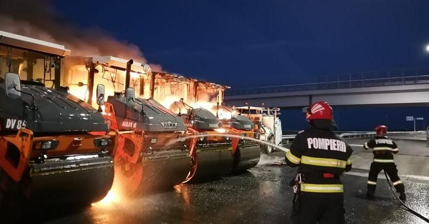 Incendiu izbucnit la patru utilaje care lucrau la drumul expres Craiova-Pitești, în județul Olt