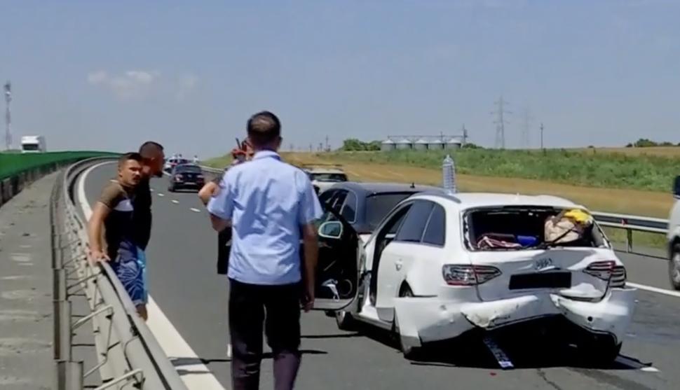 Mașină răsturnată în urma unui accident pe autostrada A2. Traficul spre mare este îngreunat